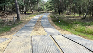 Při lesních pracích bylo důležité zachovat původní terén. Plastové pojezdové desky zajistily pevný a bezpečný povrch aniž byla lesní cesta narušena. Ilustrační text.