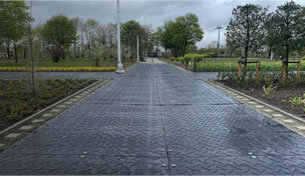 V městském parku bylo zapotřebí po delší dobu chránit zeleň při přejezdech těžké techniky. Plastové pojezdové desky splnily svůj účel na jedničku. Ilustrační text.